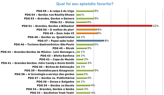 A galera gostou de ouvir as histórias de quando Eduardo Sales Filho, Maira Moraes, Flavio Soares e Dr. Tapioca, junto com os convidados Álvaro Nóbrega (Alienígenas na América) e Ricardo Ferro (Ferro Design), estiveram montados na garupa do Bozo. Sendo assim, com 22%, o Papo de Gordo 51 – Grandes, Gordos e Bêbados! ficou em primeiro lugar na preferência dos ouvintes, seguido pelos episódios 47 – Papai sabe tudo!, com 8%, 49 – Dom João VI e 50 – O melhor do pior!, cada um com 6%.