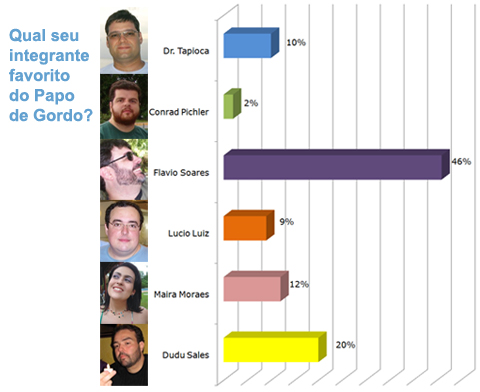 Muuuuuuuuuuuito bem, senhor Dudu Sales e toda a galera que atende pela alcunha de leitores/ouvintes de peso! Aqui estou eu, “fazedora” oficial de gráficos deste site, pronta para divulgar os resultados da nossa pesquisa e indicar o melhor e o pior do Papo de Gordo em 2010. Também, revelarei o nome de quem foi sorteado e ganhará uma linda camisa do Morsaman. Lembrando que só concorreram aqueles que se deram ao trabalho de cadastrar o seu e-mail, além de responder às perguntas e alimentar o nosso banco de dados com informações super importantes para continuarmos melhorando cada vez mais.