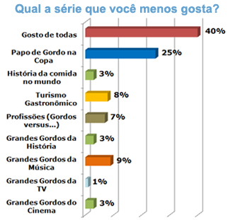 Por outro lado, apesar de 40% da galera ter dito que gosta de todas as séries, a que menos agradou nossos ouvintes é a Papo de Gordo na Copa, que amargou 25% de rejeição. Ainda bem que a próxima Copa do Mundo será só daqui a 4 anos!