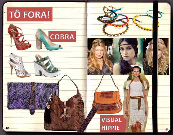 Depois de falar sobre macacões, pantalonas e vestidos e saias longas, minhas roupas preferidas entre os hits do Verão 2011-2012, chegou a hora dos acessórios. A verdade é que, com essa onda de releituras dos anos 70, as peças chegam exaltando o artesanal, com muitas coleções apostando em técnicas manuais como tricô, crochê e bordados. Com isso, os looks ganham um toque rústico com rendas, ráfia e até tapeçaria! Isso sem falar das texturas e couro de cobra. E quer saber? TÔ FORA DISSO!
