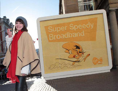 Ainda em Londres, uma empresa britânica encontrou uma forma no mínimo curiosa de divulgar seus serviços de internet e telefonia. A responsável foi a artista plástica Prudence Staine, que usou 110 kg de queijo na produção de um outdoor de 20 metros quadrados – com direito até ao desenho do Ligeirinho!