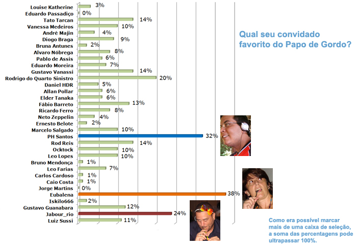 Eubalena, do Monalisa de Pijamas, foi a convidada preferida dos nossos ouvintes, com 38% dos votos. Ela foi seguida de perto pelo PH Santos, que ficou com 32%. Mas legal mesmo foi a coincidência (?) do nosso amigo carioca Maycon – também conhecido com Jabour_rio – ter ficado com 24%. Huuuuuuuuuum! Poderooooooosa!