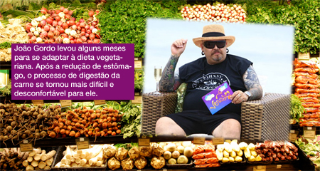 Já para João Gordo, a dieta vegetariana levou meses de adaptação até que conseguisse cortar a carne de vez da alimentação. Ele, que vive numa luta constante contra seu próprio peso, já fez redução de estômago e sofre de diversos problemas de saúde devido à obesidade.