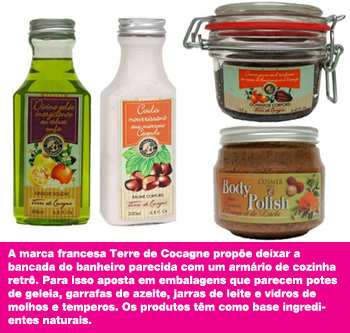 A Terre de Cocagne é uma exemplo dessa junção de cosméticos e comida. A marca francesa apostou nessa tendência trazendo produtos de beleza em embalagens que parecem potes de geleia, garrafas de azeite, jarras de leite e vidros de molhos e temperos. A ideia é deixar a bancada do banheiro parecida com um armário da cozinha retrô.