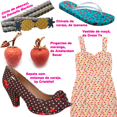 Ela mostra em exemplos que as frutas não estão apenas nos acessórios de cozinha e agora aparecem em estampas de roupas, bolsas e calçados, brincos e pingentes, etc. Confesso que me apaixonei perdidamente por esse sapato com estampa de cereja (Cristófoli). Achei forçadas as jóias em forma de frutas, mas acho que em crianças elas combinariam com perfeição!
