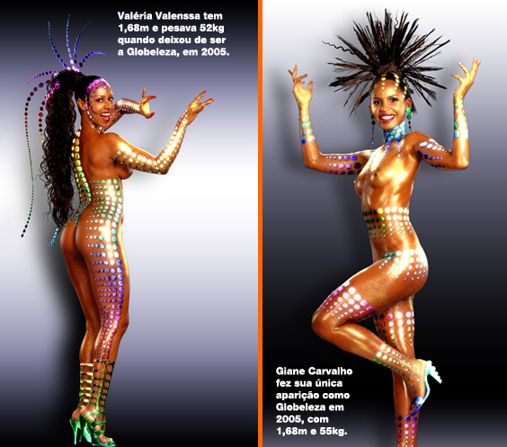 Não sei se a Globeleza está emagrecendo, as medidas não são tão diferentes assim, na minha opinião. Depois de 2006 eu meio que parei de ver TV, então mal vi a Globeleza atual. Sei lá, a Valéria tinha o corpo mais perfeito que eu já vi, mas a nova moça tem um biotipo diferente e samba bem. Eu só não curto esse cabelo dela, meio alisadão, nada a ver.