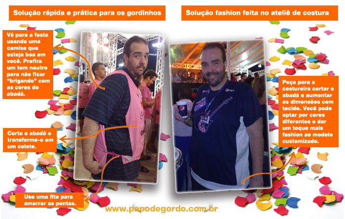 Viram aí? Não adianta dizer que estão com preguiça, porque as duas dicas para customização dos abadás e camisas de camarote são super fáceis. A primeira, mais simples, só demanda uma tesoura e algumas fitas. Já a outra deixa o trabalho para a costureira! Portanto, não tem desculpa para aparecer todo apertado dentro da roupa.