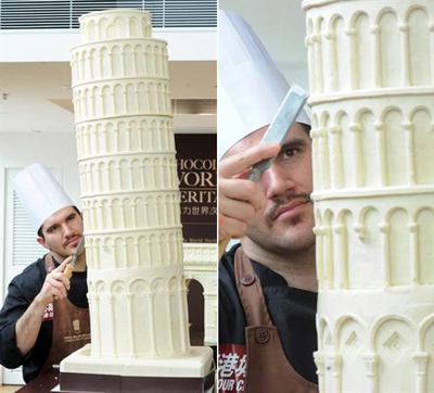 Nossa primeira sugestão: uma réplica da Torre de Pisa criada pelo chef italiano Mirco Della com muuuuuitos quilos de chocolate branco.