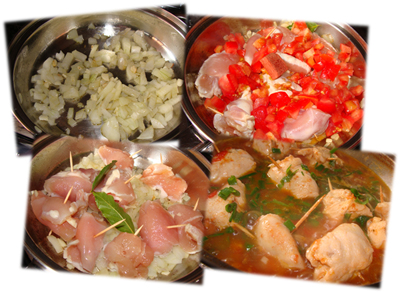 Refogue a cebola e o alho no azeite ou em um pouquinho de óleo. Acrescente o frango e as folhas de louro. Deixe fritar um pouco.