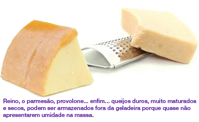Reino, o parmesão, provolone… enfim… queijos muito maturados e secos podem ser armazenados fora da geladeira porque quase não apresentam umidade na massa.
